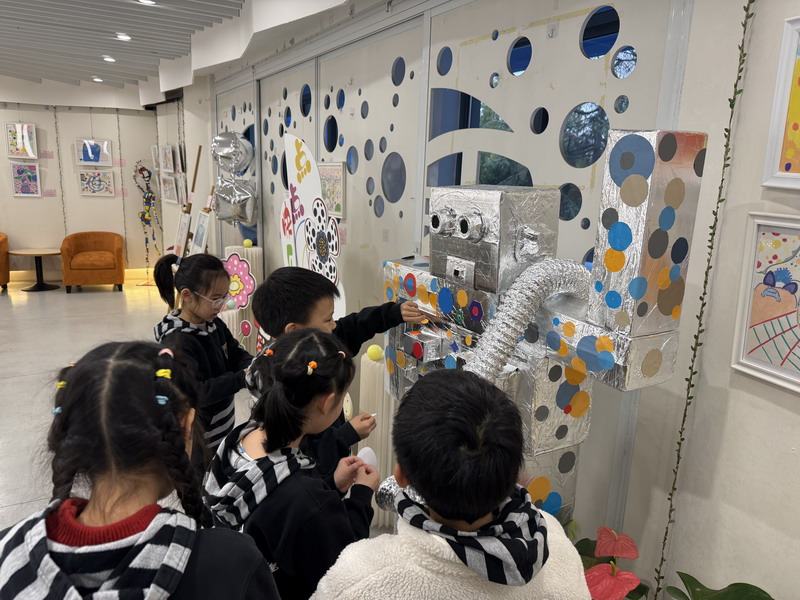 除了平面绘画,孩子们还将“圆”的元素延伸到立体创作中。展区中最吸引目光的,是由学生参与装饰完成的大型机器人艺术装置。