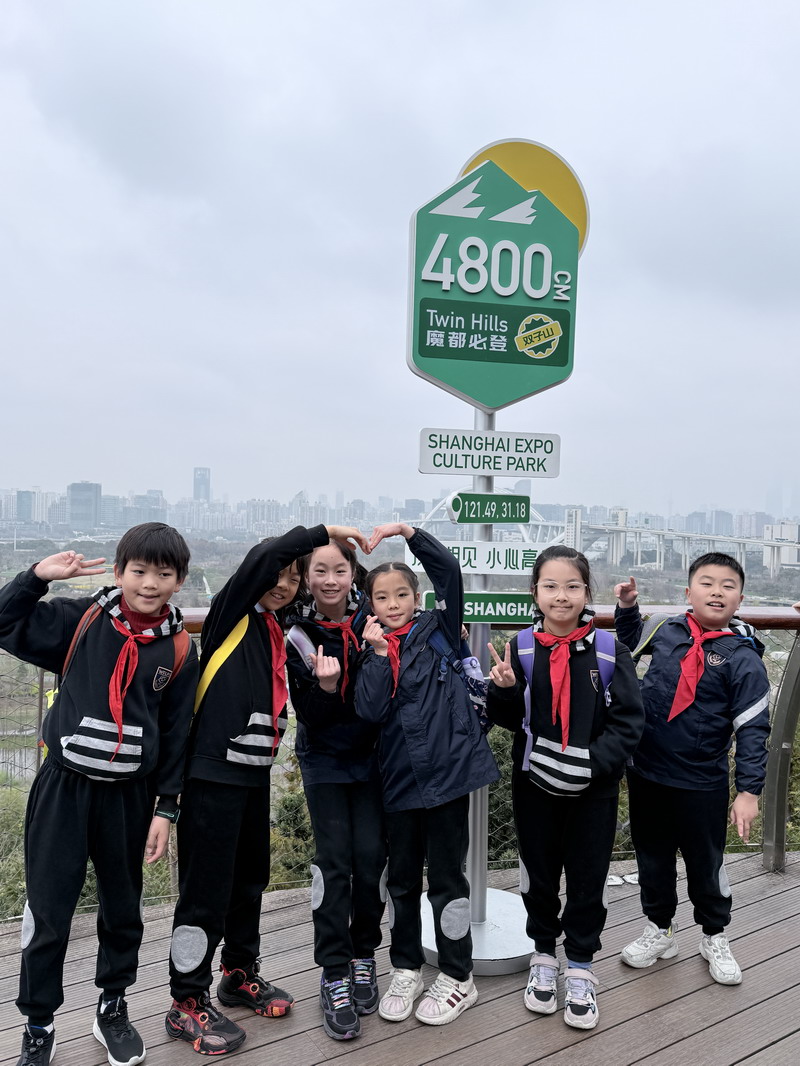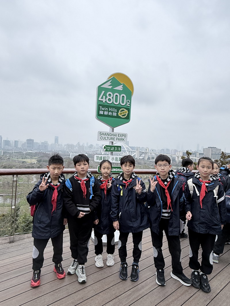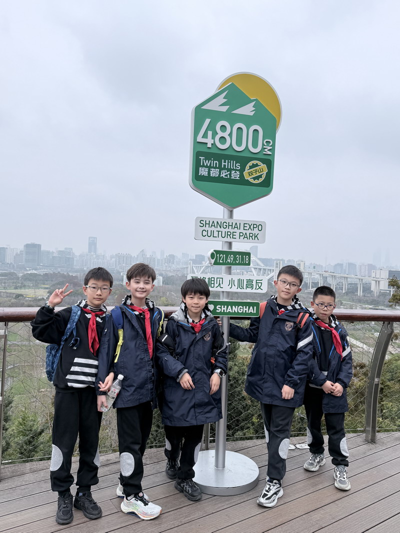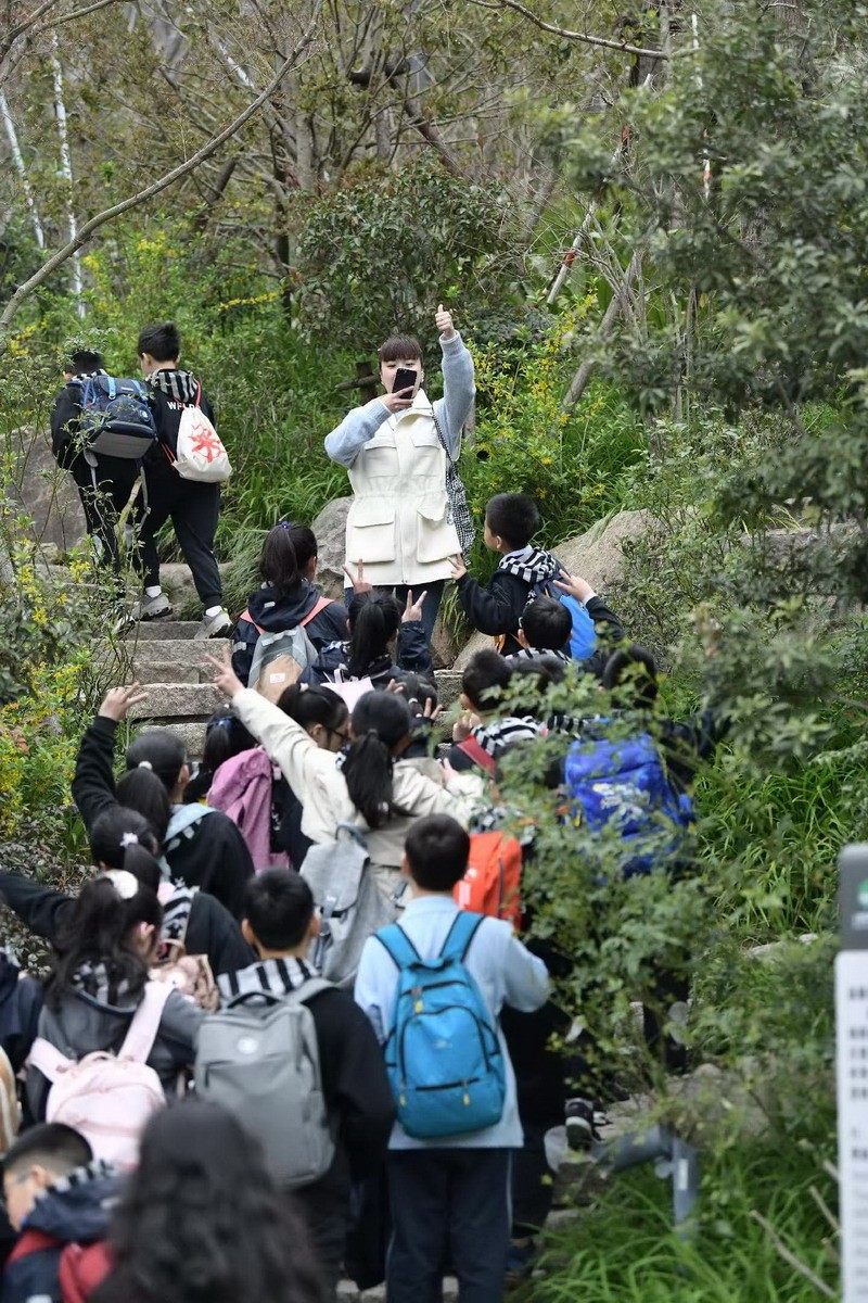 上午,师生们首先来到双子山。作为上海市中心的特色人造山体,主峰海拔48米,山间绿植繁茂、景致精巧,一步一景皆成画卷。同学们沿着步道拾级而上,登高望远,将城市风光与自然绿意尽收眼底,在登高健体的同时,感受春日生机与自然之美。沿途,老师们结合语文第五单元“按游览顺序写游记”的学习要点,现场指导孩子们运用移步换景、空间顺序的方法观察景物、梳理思路,让写作方法在实践中落地生根。
