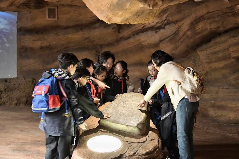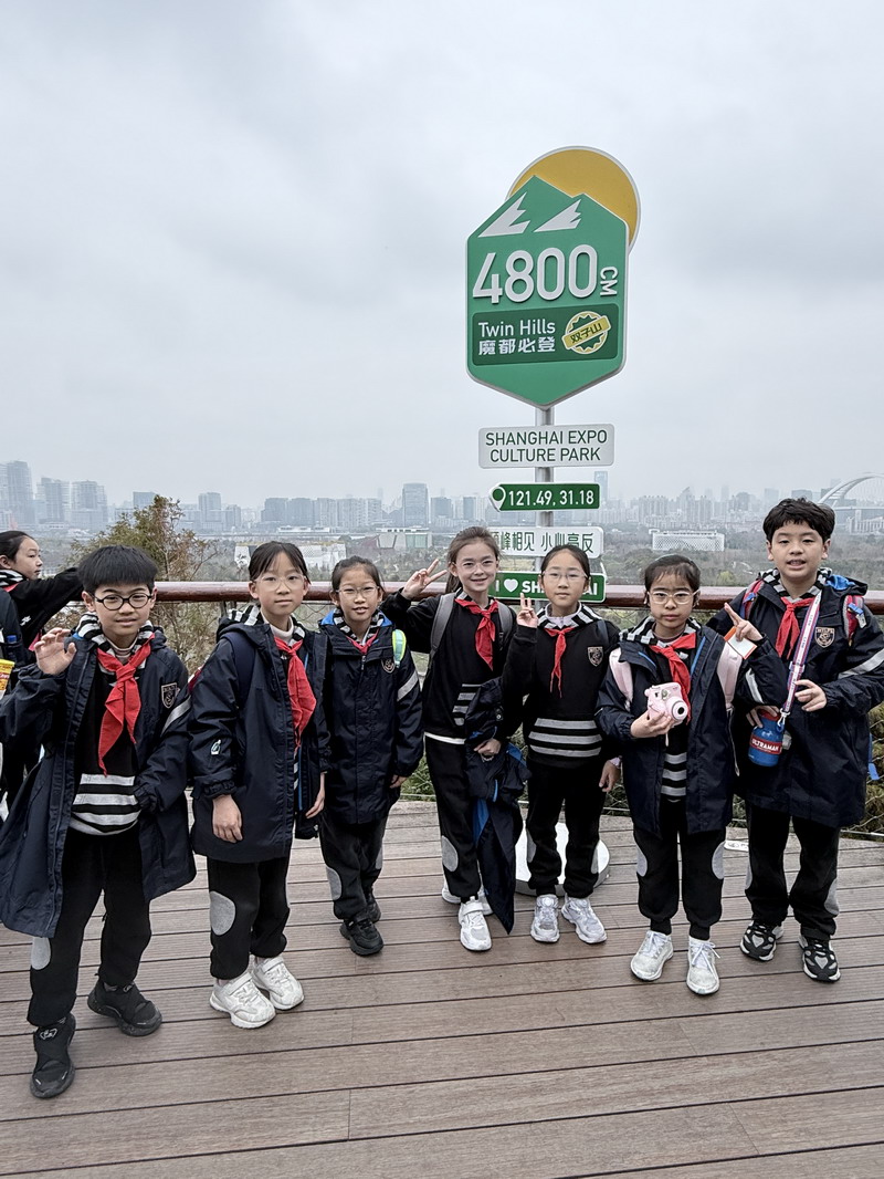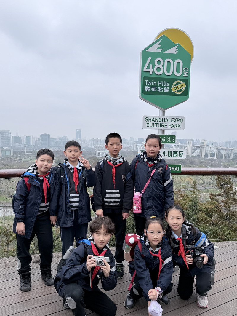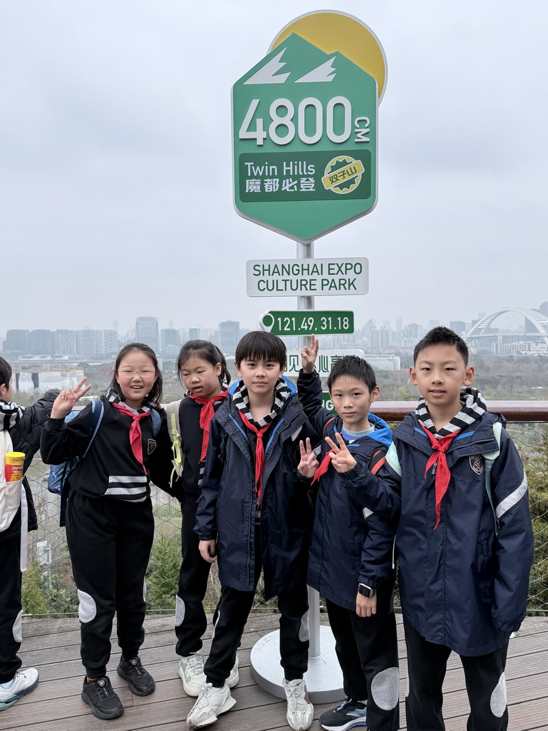 上午,师生们首先来到双子山。作为上海市中心的特色人造山体,主峰海拔48米,山间绿植繁茂、景致精巧,一步一景皆成画卷。同学们沿着步道拾级而上,登高望远,将城市风光与自然绿意尽收眼底,在登高健体的同时,感受春日生机与自然之美。沿途,老师们结合语文第五单元“按游览顺序写游记”的学习要点,现场指导孩子们运用移步换景、空间顺序的方法观察景物、梳理思路,让写作方法在实践中落地生根。