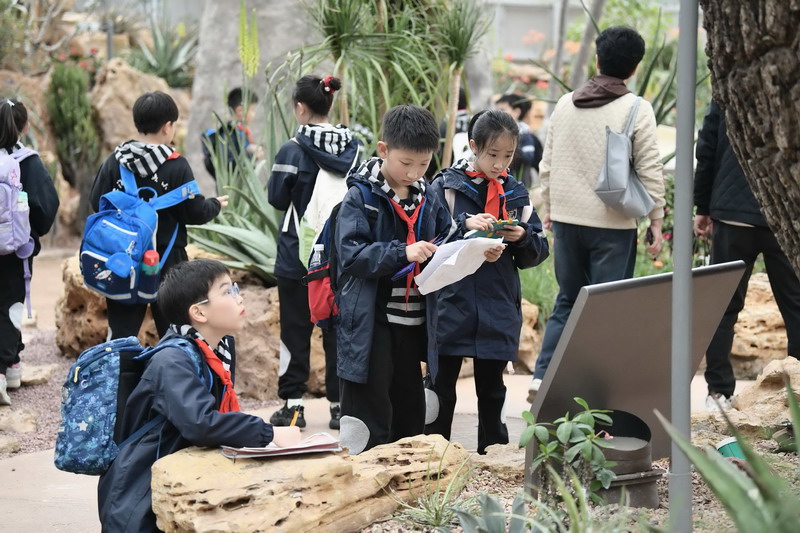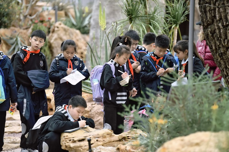 下午,全体师生有序进入温室花园。这座大型生态温室包含海市沙洲、云上森林、云雾峡谷三大主题场馆,汇集了种类丰富的热带植物、沙漠绿植、雨林花卉与奇花异草。在老师的引导下,同学们安静有序地参观游览,仔细观察植物的形态特征、生长环境,认真记录所见所感,用笔描绘细节、积累素材,将眼前的自然美景转化为游记习作的鲜活内容。