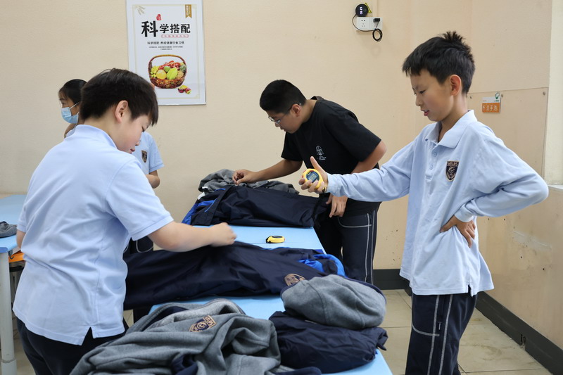 4月30日上午,学生餐厅化身为竞技场,一个月前在导行课上培训的分高低年级的劳动技能今天就要检验了。“预备——开始!”低年级的“整理书包大赛”中,孩子们化身“时间管理大师”,短短两分钟内,书本、文具、水杯各归其位,动作之麻利令人称赞。而高年级的“叠衣服比赛”则考验耐心与细致,一件件校服外套被折叠得整整齐齐的饺子模样。餐厅内,加油声与欢笑声交织,劳动的成就感在竞技中悄然生根。