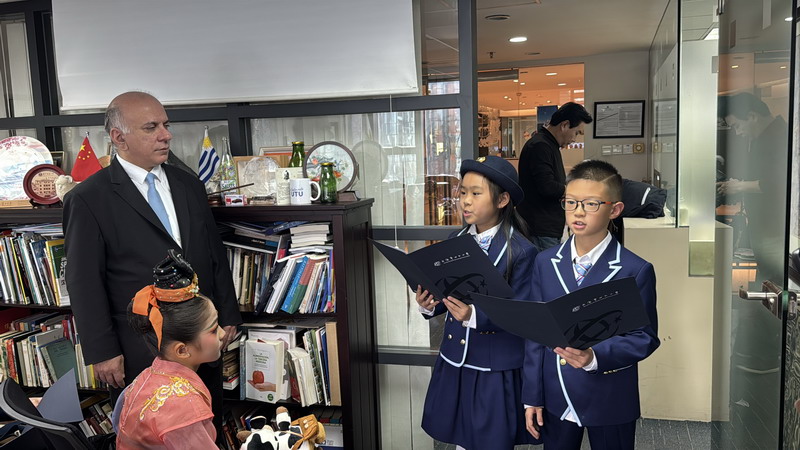 多语诗朗诵成为当天最动人的环节。学生们用中文、英语、西班牙语三种语言演绎乌拉圭著名诗人马里奥·贝内德蒂(Mario Benedetti)的《停顿》与巴金的《繁星》。不同的语音韵律交织流淌,仿佛几条来自远方的溪流,最终汇入同一条情感的江河——语言虽有边界,但那些对生活、生命与成长的感悟,却在每个人心中激起了相似的波澜。超越国界的文学此刻成了最亲切的桥梁。总领事鼓励孩子们多学语言,学好语言。