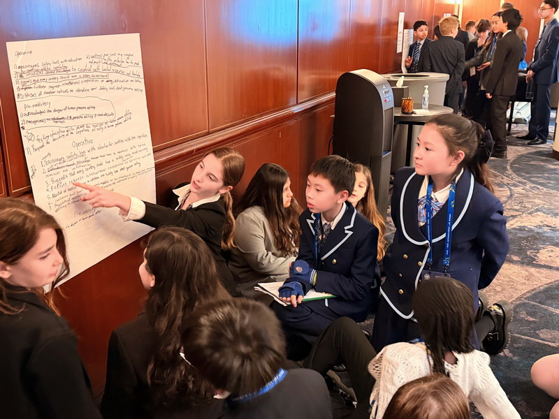 在联合国总部参访时,同学们驻足于《破碎的地球》与《打结的手枪》展品前,从具象艺术中读懂“守护家园”“珍爱和平”的深意;同学们探访经社理事会厅、安理会会议厅、联合国大会厅,近距离感受国际议事的庄重氛围,理解联合国“维护和平、促进发展”的核心使命,直观体会“大国责任”与“全球协作”的重量;在MMUN开幕式上,同学们身着正装,从容步入联合国金色大厅,向与会其他代表传递尊重与友好,这也是中国少年文化自信的生动表达。