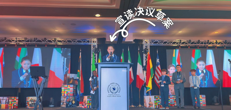 在闭幕式宣读草案的发言环节,张君雅同学作为代表,清晰阐述本国立场,用数据与案例支撑观点,逻辑清晰、表达流畅,赢得了全场代表的认可。