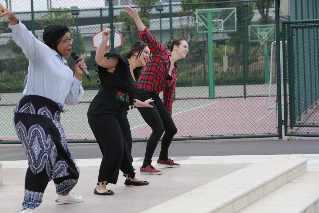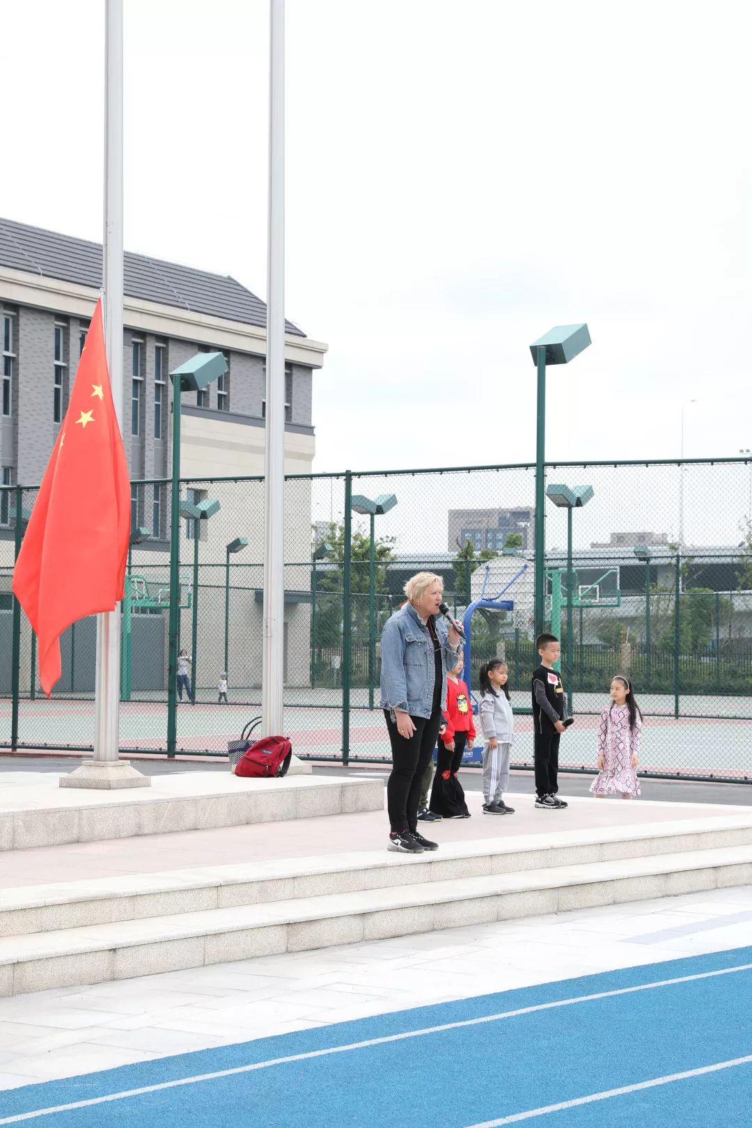 在庄严的升国旗奏国歌环节之后,外教们带领操场上的爸爸妈妈们和孩子们一起挑起了欢快的暖场舞。