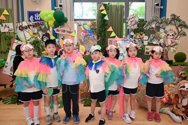 双语部一年级的萌宝们化身为一群野生动物,用自己可爱的舞姿生动演绎各种动物,展示它们的的生命力。看,这是一A班萌宝们饰演的热带雨林动物——大猩猩、金刚鹦鹉、树懒和美洲豹。