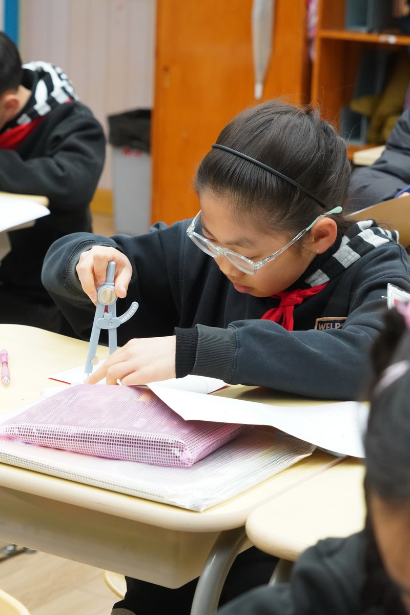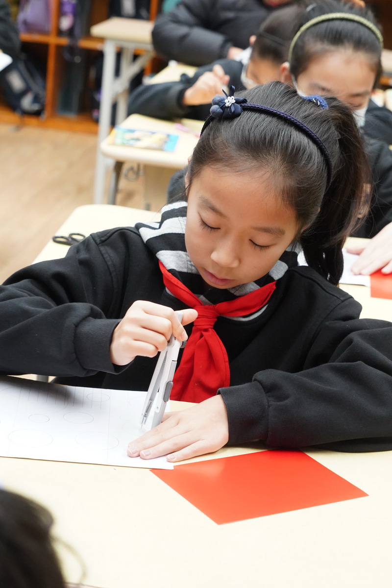在创作开始前,孩子们先在数学课堂中系统认识“圆”——从圆心、半径、直径等基本概念出发,理解圆的结构与特征,并探究圆在生活中的广泛应用。在此基础上,学生用亲手制作的圆规尝试画圆,在尝试中体会“精准”与“变化”的关系,让抽象的数学知识转化为可感、可用的实践经验。