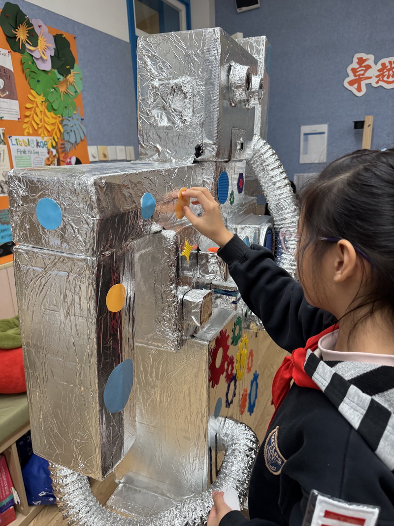 机身布满不同大小、不同材质的圆形贴片;金属质感与彩色圆点形成强烈对比;冷冰冰的“机器人”被孩子们一点点贴出温度与童趣。