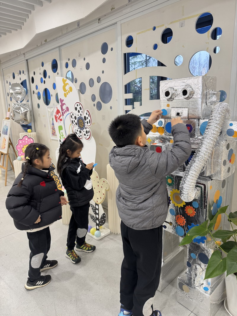 除了平面绘画,孩子们还将“圆”的元素延伸到立体创作中。展区中最吸引目光的,是由学生参与装饰完成的大型机器人艺术装置。