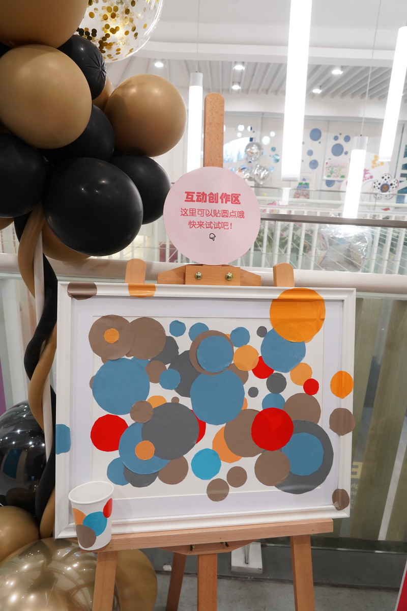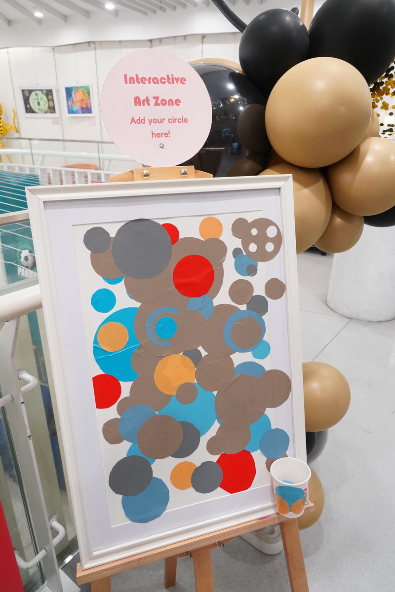 本次艺术展特别设置了“互动创作区”。在这里,孩子们可以用画笔画圆、用彩纸剪圆、用各种材料制作圆形贴片,然后走进展区,将自己的“圆”贴到空白画框上。