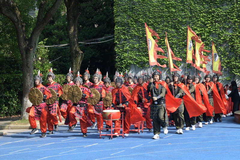 二 2 班 “华夏传承者”:爸爸们身着秦国战甲,从历史中走来;孩子们一袭红妆挥舞旗帜,喊出“少年强,则国强” 的时代强音,用跨越时空的仪式感诠释文化传承。