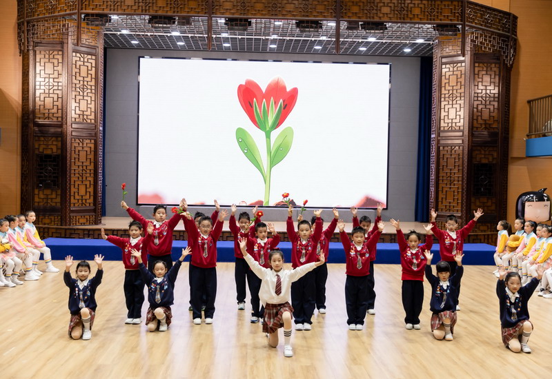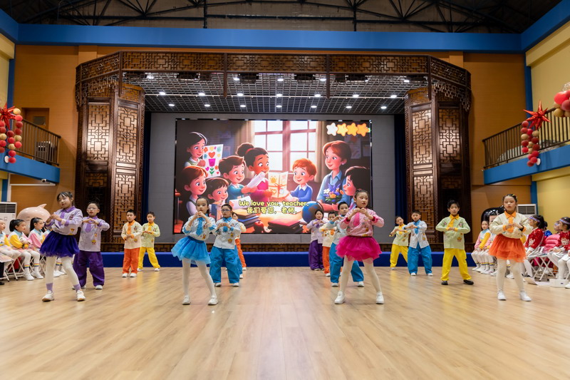 随后,舞台成为传递心意的信笺。二1班的歌舞《裹着心的光》,以童声与舞姿诉说老师如春风、如暖阳般的陪伴;二3班的舞蹈《老师,我爱您》以稚嫩却坚定的动作,演绎出对老师那份严慈相济的感激。