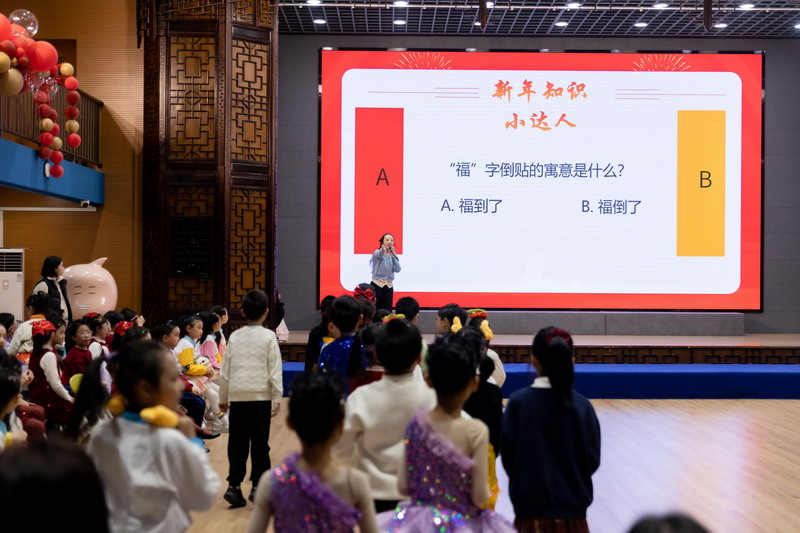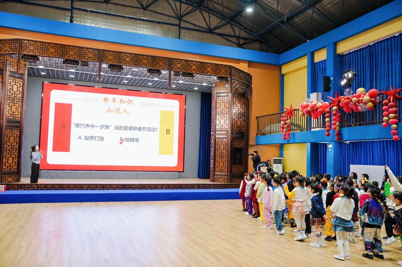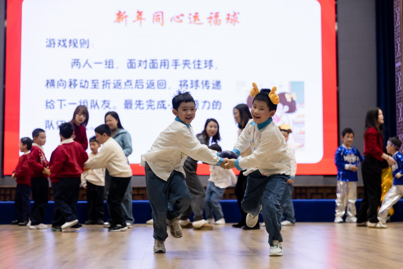 游戏环节将活动推向新的高潮。在老师们的带领下,“新年福气蹲”“新年好运接接接”“新年同心运福球”等游戏接连登场。师生全心投入,现场笑声迭起,协作与默契在游戏中悄然凝聚。“新年知识小达人”环节寓教于乐,孩子们积极竞答,展现广博见识,点亮智慧星光。