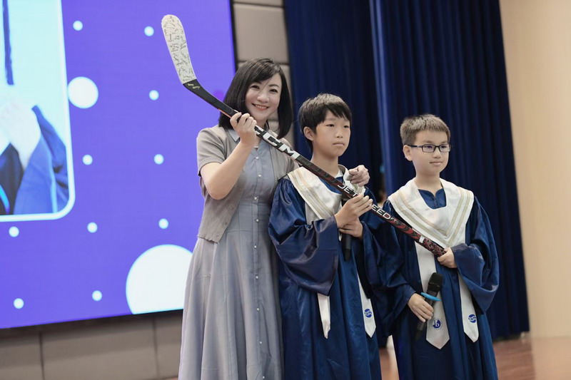 毕业生代表陈明志和陈卓君分享了过去五年中他们是如何在一场场精彩纷呈、意义深刻的活动中成为一名出色的IB Learner。演讲结束后,他们将签有全体五年级学生名字的冰球棒送给母校留念。