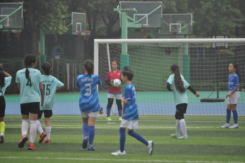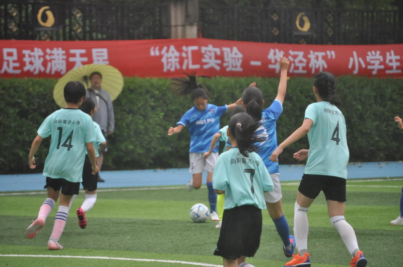 On June 2nd, the fine rain wove a hazy veil over the green field of the "Xuhui Experimental - Huajing Cup" Primary School Girls' Football Match. The showdown between the WFLPS International Division Girls' Football Team and the Xiangyang Yucai Primary School Girls' Football Team kicked off amidst the rain. Both teams had suffered defeats in their opening matches, so this game was not only a contest of skills and tactics but also a test of will and conviction.