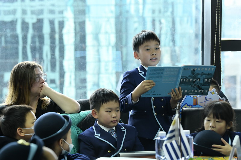 乌拉圭东岸共和国驻上海总领事马龙先生(Marcelo Magnou)微笑着迎接孩子们。他生动地讲述了乌拉圭的风土人情,带大家“走”遍了乌拉圭:从广袤的潘帕斯草原到都市街角的热情探戈,从一杯共享的马黛茶到全球热爱的足球。遥远国度的轮廓,在孩子们心中渐渐清晰。