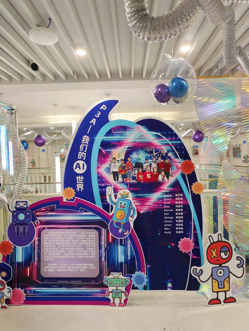 继“科技使生活更美好”全校迎新活动之后,世外小学国际部P3A班的十一位同学延续对科技的探索与想象,近日举办了一场名为“我们的AI世界”的集体画展。同学们以画笔为媒介,结合自己对科技与人关系的思考,描绘出与人工智能共融的未来图景,让科技从抽象概念化身为亲切的生活伙伴。画展上,一幅幅充满童真与创意思考的作品依次展开。这些作品围绕“科技与生活共生”的主题,从艺术创作、城市发展、医疗健康、节日文化乃至星际探索等多个维度,描绘出温暖而具象的未来。