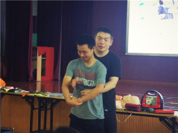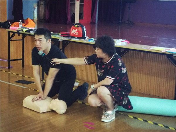 一番讲课过后,翟教官要求每位老师亲自体验急救中的"心肺复苏",因为只有通过实际的模拟操作,才能完整地学到急救方面的知识。每位老师上台体验,翟教官耐心地指导大家的手势和用力程度以及时间。