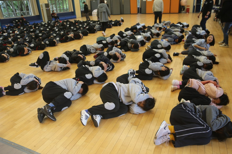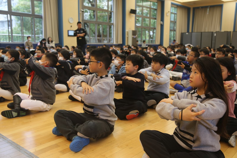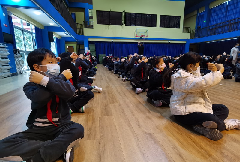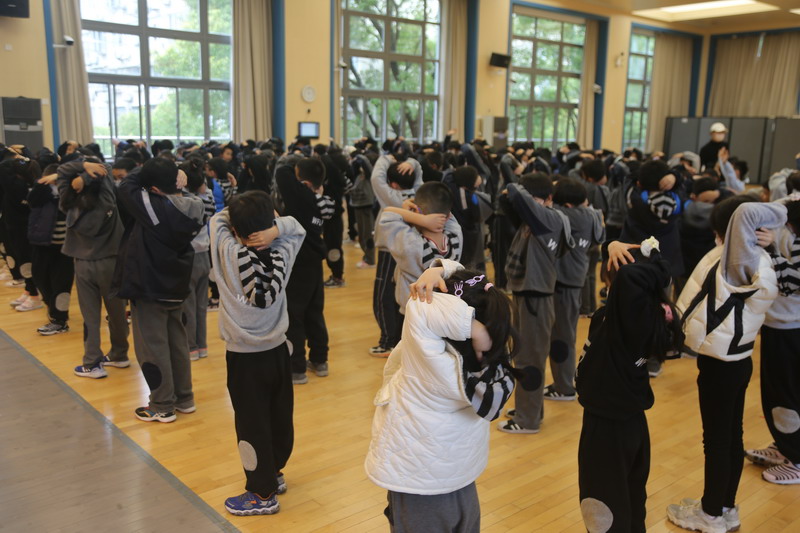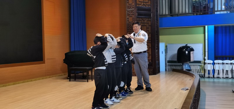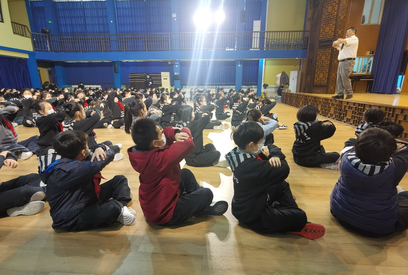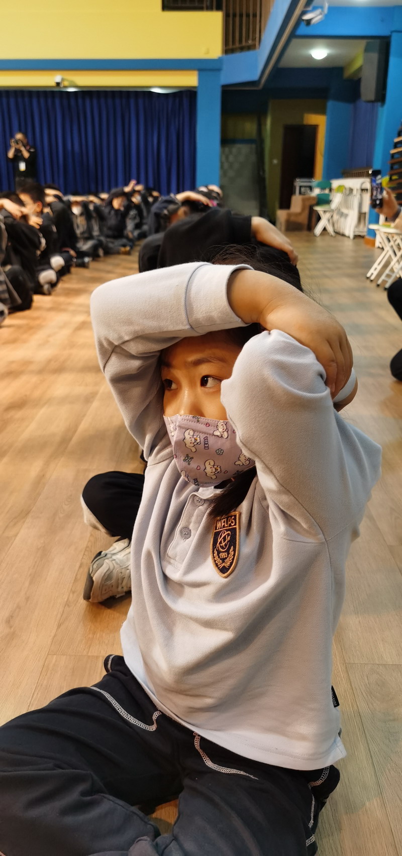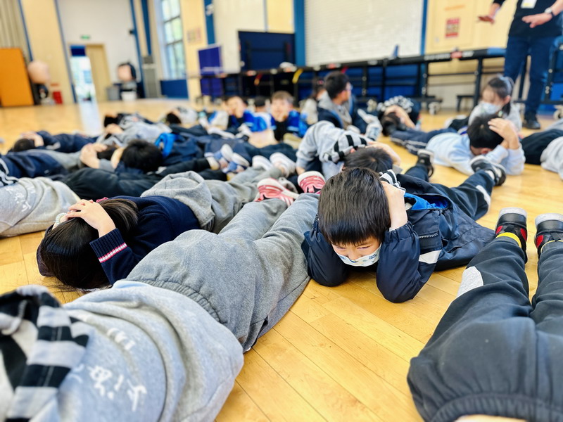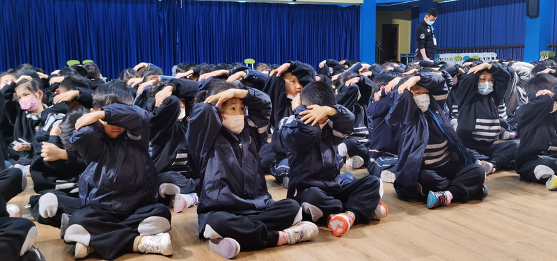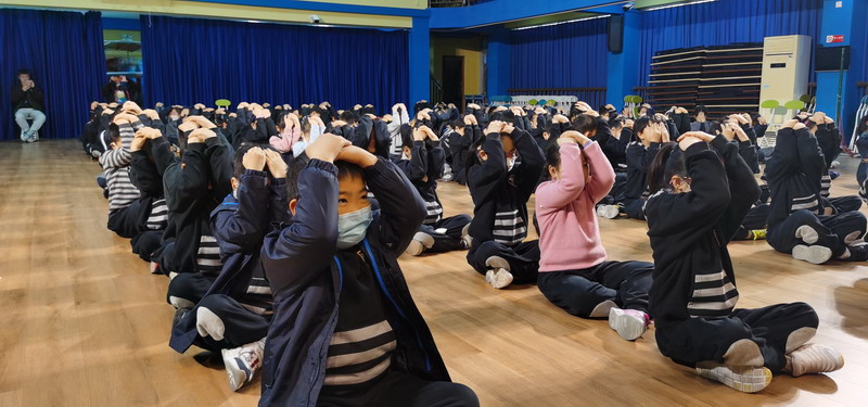 “被掩埋或遇到危险时,怎样向外界发出信号求救?”、“高空抛物的行为是对与错?高空物品掉落时,应该怎样做出反应?”低年级同学们在教官的带领下,学习了在遇到被掩埋或遇到危险时,怎样发出国际求救信号进行求救。高空物品掉落躲不掉的情况下,通过前抱,左抱,右抱来保护自己的头部,教官通过拍打小游戏来告知同学手部可以帮助自己保护好最核心的头部。
