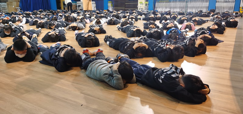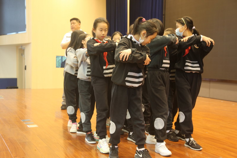 中高年级的同学们在教官的带领下,先复习了之前学过的安全课程的内容和动作。伴随着案例事件的讨论,同学们了解到了“踩踏事件”严重性,从而对“在校园里上下楼梯时,课间在校园里,不可以奔跑、推挤。”有了更加清晰的认识。