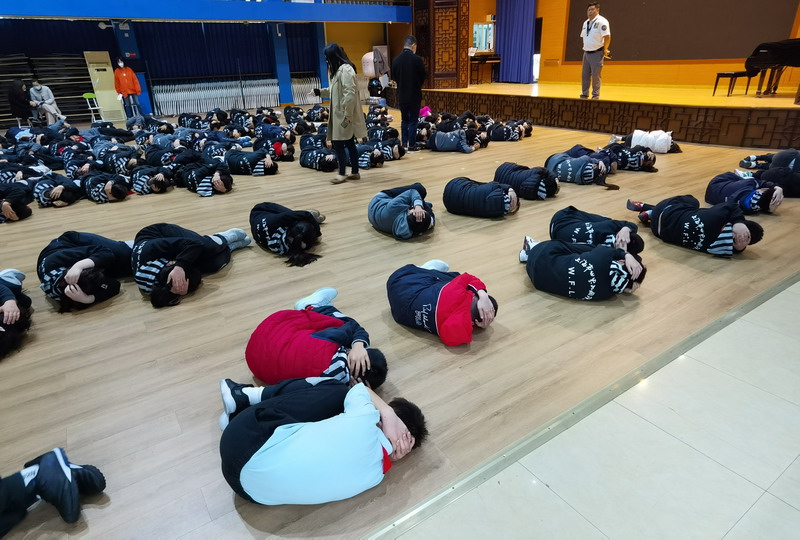 那么“当遇到踩踏事件时,该如何反应?”在教官们的指导下,同学们了解到在遇到异常拥挤的人群时,左手握拳,右手握住左手手腕,双肘撑开平放胸前,以“半臂”姿势形成一定空间保证呼吸。看到别人摔倒,不再前行,大声呼救,告诉后面的人不要靠近。保持镇定并稳住重心,防止摔倒。尽量向侧方移动,移出人流。如果可以,抓住身边牢固物体。如果不小心摔倒,要尽量保护头部,身体侧卧手肘靠近膝盖蜷作“小龙虾”状,使自己可以有充足的呼吸空间。