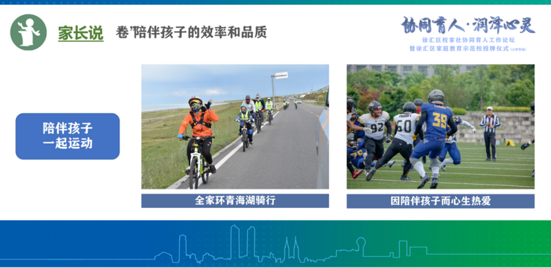 我们在课外鼓励并陪伴他们体育锻炼和户外活动,让运动成为他们、我们自己良好生活习惯的一部分,身心健康的人自带光芒。我先生和孩子们有共同的体育项目教练,我们一家也会一起跑步或滨江骑车,疫情期间我们还欢乐地在家里跳绳比赛,我朋友圈里的达人家长更是在陪娃的过程中把自己“卷”成了业余运动员。