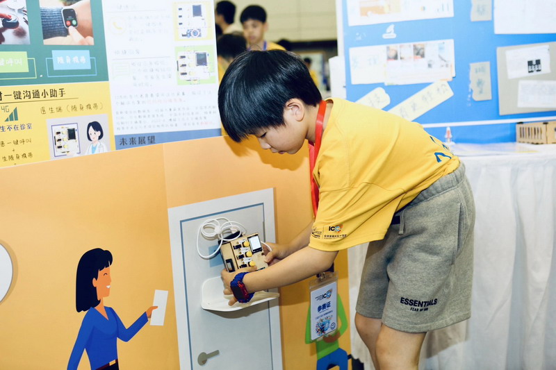7月22日,我独自一人踏上了出征全球发明大会的国赛征程。这一次,我不仅带去了我的作品,还带上了“诊室门口”的场景展板。在演示的时候,我将装置放在展板的诊室大门的托架上,真实地模拟出使用场景,并特制了使用说明书,贴在诊室的门上。这样的展示更清晰地解释了发明的使用场景和产品的特点。在3000名选手参与的科创海洋里,我的展示引起了更多人的关注。我突然发现,我的科创小发明不再只是模拟演示、记录日志,而是可以真正地投入到生活中,帮助到每一位病患与医生的产品。