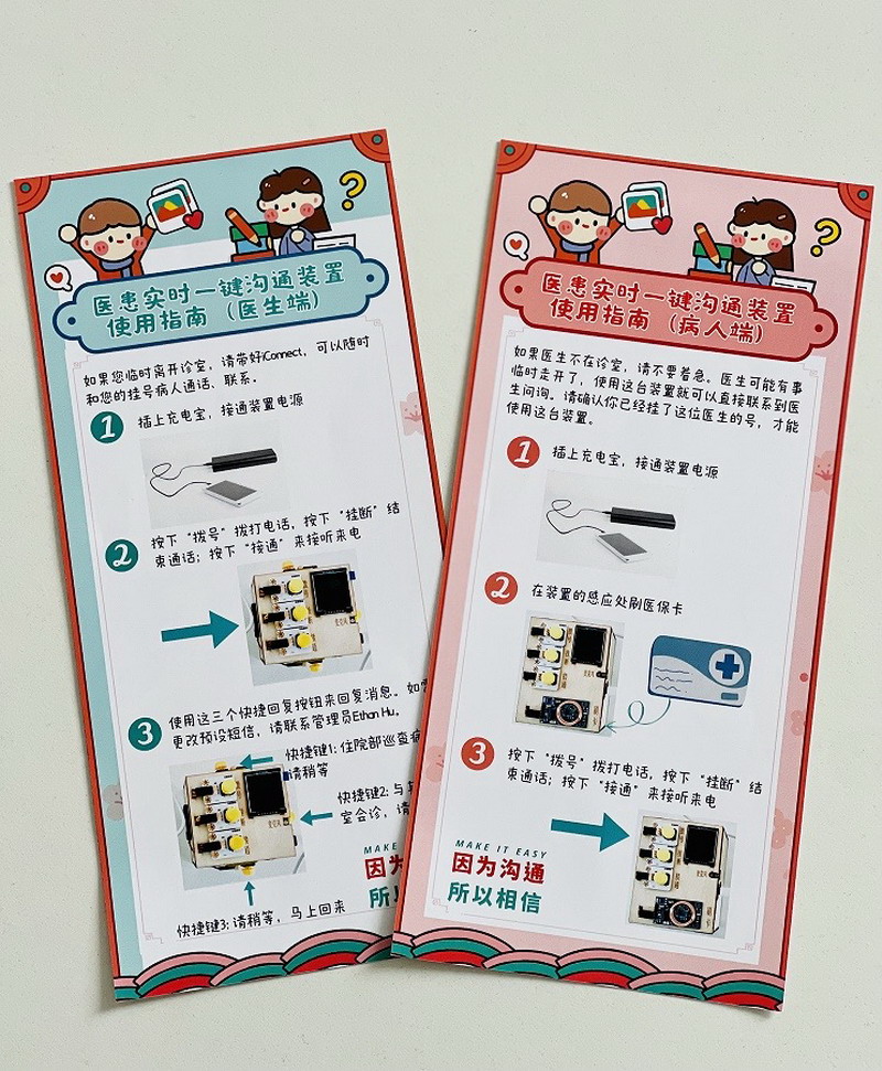后来的一天,爸爸的朋友来家里做客,我们聊天时听到他在医院看病的不愉快经历。他在诊室门口等了很久,却不见叫号,去找护士询问也没有得到准确答复。我感到非常难过,爸爸平时的工作已经很辛苦了,为什么病人们还是不满意呢?于是,我决定探寻这个问题的答案。通过阅读相关的心理学读物,进行广泛的问卷调研,我终于明白了透明、及时的沟通可以增进医患间的理解。于是i-connect医患实时一键沟通小助手诞生了。这个双向沟通装置,能让医生和病人的沟通更实时、更直接、更高效,病人和医生就能在最易产生矛盾的时候直接说上话。