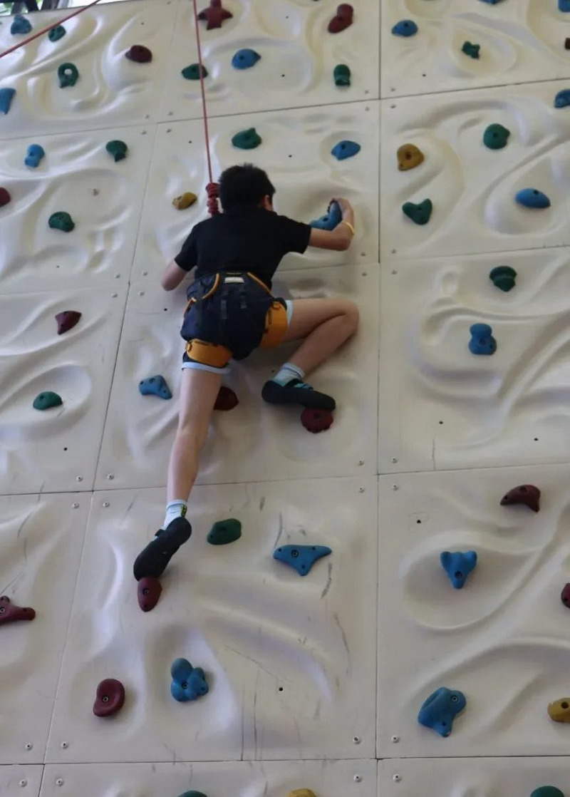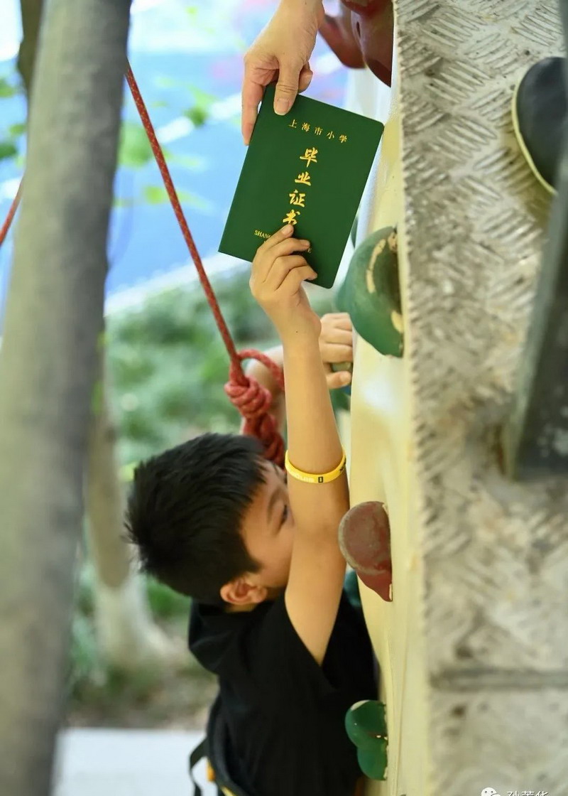 世外小学五年级学生要获得毕业证书,必须攀上一座墙。攀岩课程作为毕业课程之中的一部分,校长站在攀岩墙的顶端,当孩子攀登最上端的终点之后从校长手中接过毕业证书。