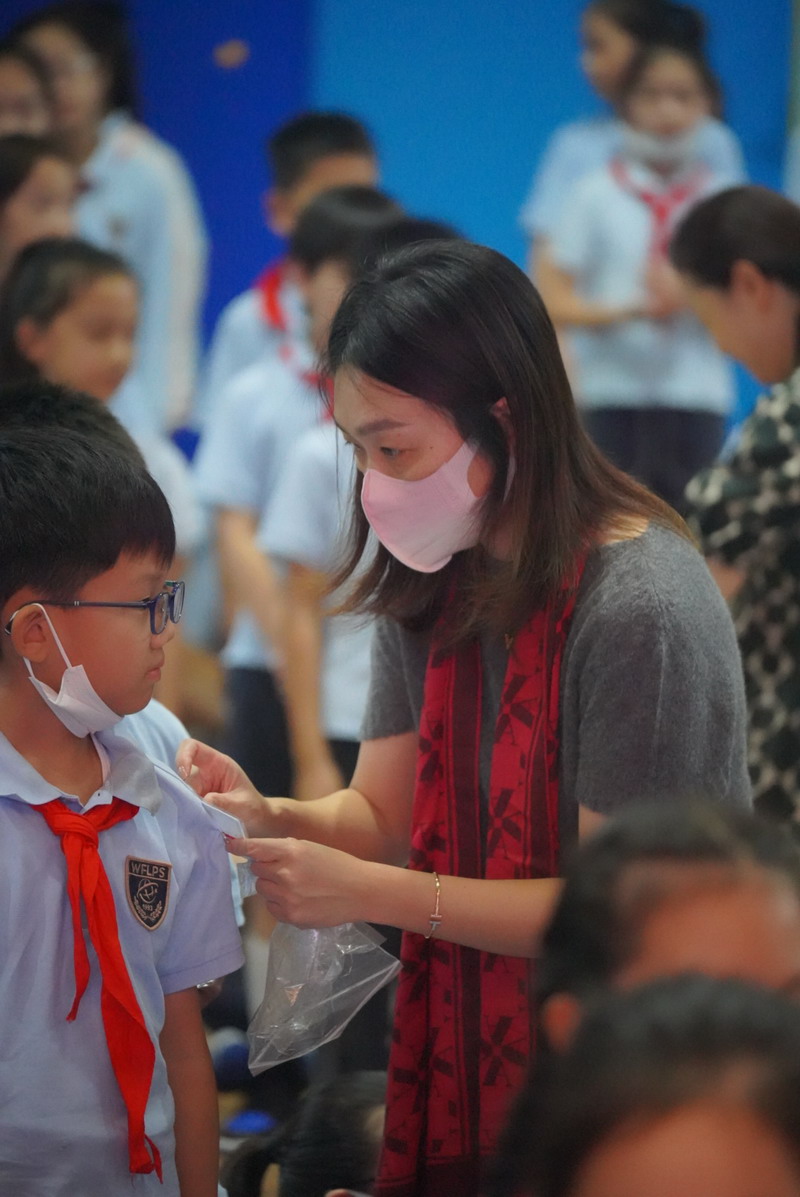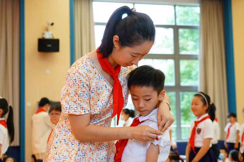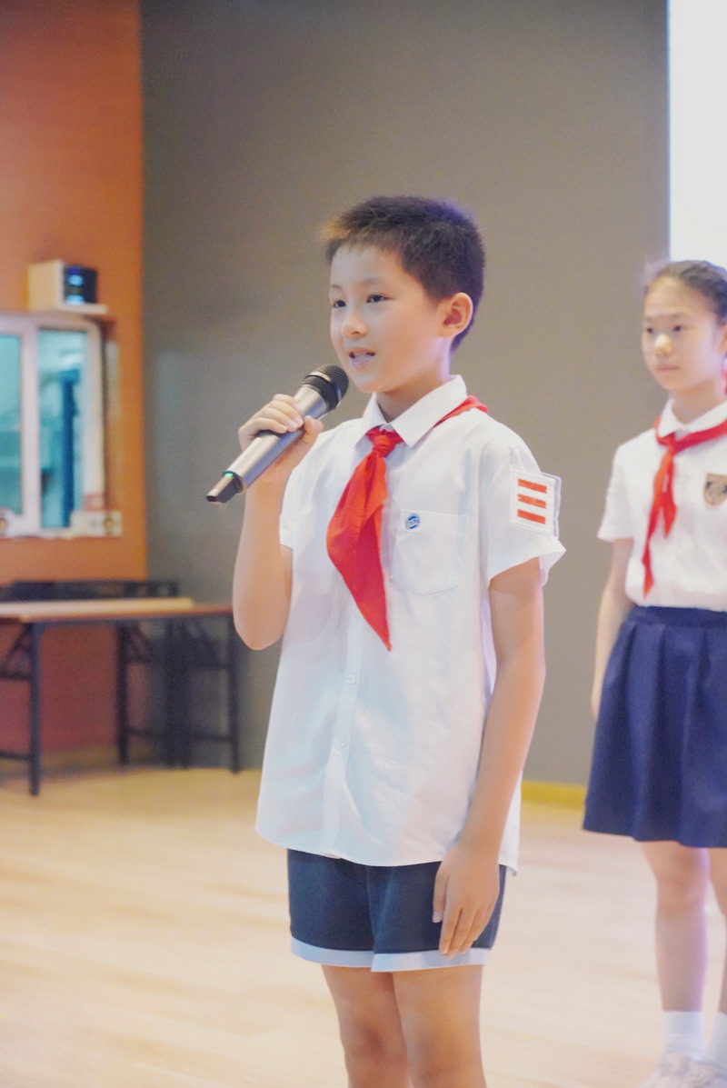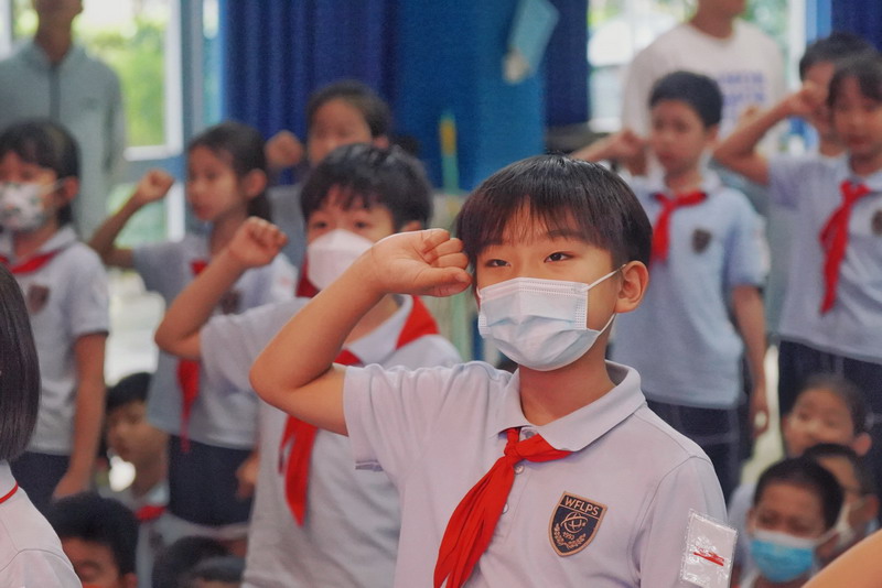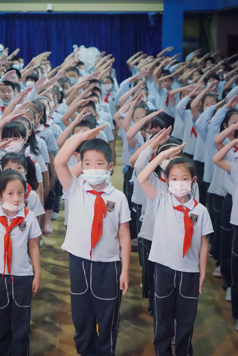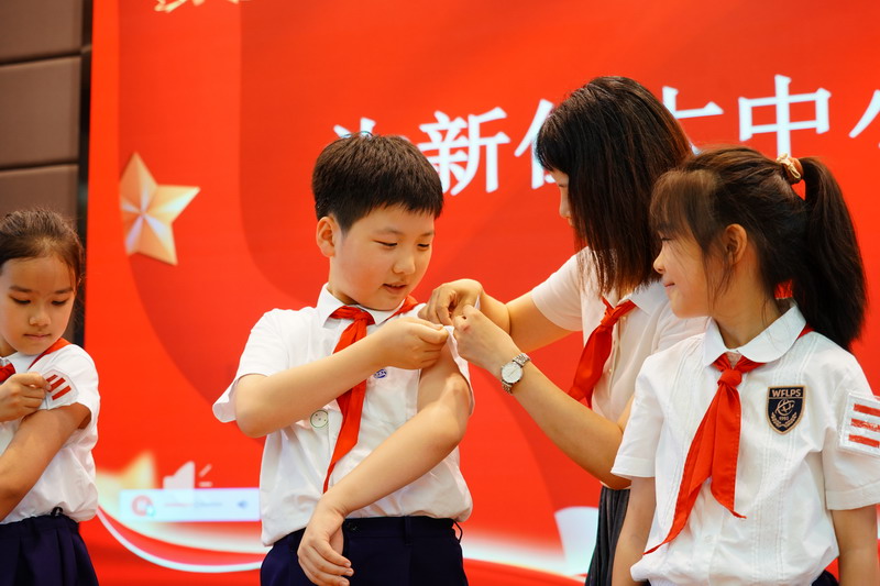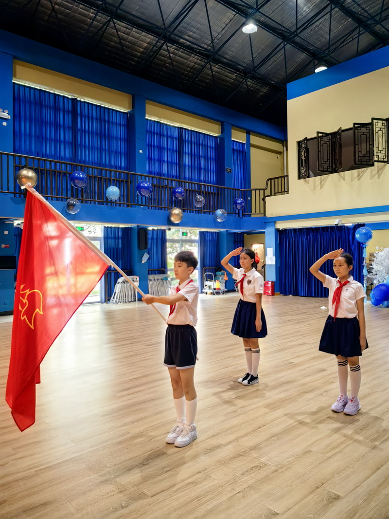 当天中午,世外小学境内部双语部9名大队长在体育馆佩戴上崭新的队长标志,神采奕奕地合影,共同庆祝中国少年先锋队建队日的到来。三至五年级各中队聘请了中队辅导员,大队辅导员为大队长佩戴标志,中队辅导员为总计约60名中队长、96名小队长佩戴标志。