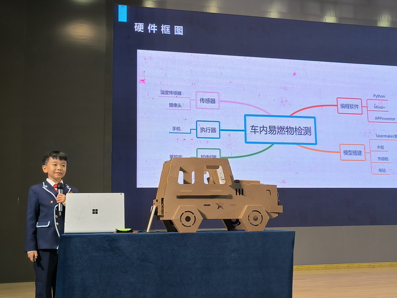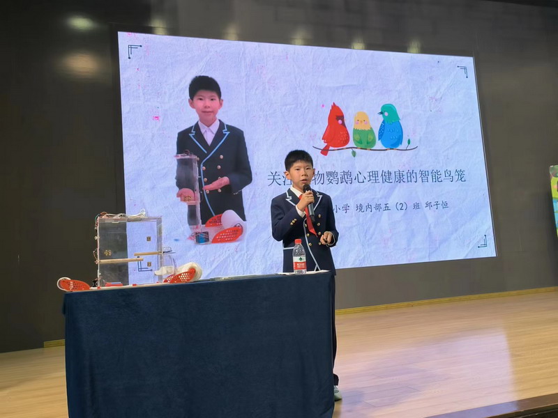 五1班孙海粤同学的《车内易燃易爆物品安全检测装置》,分享了通过识别车内遗留物品进行筛查报警的创意;四1班曹硕同学与四2班陶栎旸同学合作研究的《智能植物角》,聚焦了班级植物角盆栽存活率不高的解决办法;五4班金知圻同学的《校园废旧笔芯回收装置》,号召同学们一起参与到环保节能的行动中来;四4班黄恪同学的《教室通风情况和疫情传播研究》,根据世外小学地理位置与风向关系提出了不同季节教室通风、降低空气传播传染病的风险;五2班张亦超同学的《流浪猫狗慈善捐助喂养机》,以“云喂养”的方式给爱心人士打开了新思路;五2班邱子恒同学的《基于ESP32的防止鹦鹉抑郁智能鸟笼》,给宠物鹦鹉提供了全方位的细致关怀。