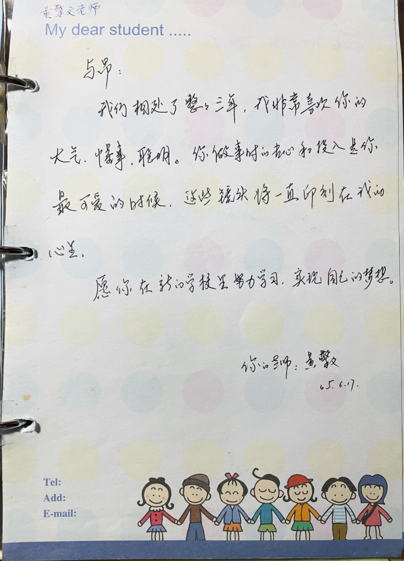 到了三年级,黄老师成为了我的班主任,她是一名严师,更像一位慈母。她的悉心教导让一个当时有着无穷能量和奇思妙想,却不知如何踏实学习的男孩开始沉下心来,懂得一步一个脚印朝着自己的目标努力。