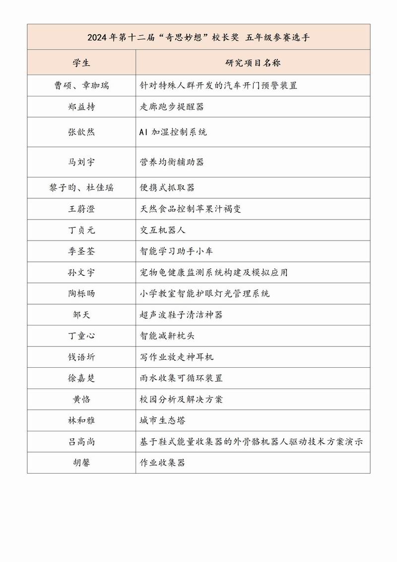 活动最终评选出本届“奇思妙想”校长奖——特等奖、优胜奖、参与奖,以及由三、四、五年级学生们投票选出的人气奖。每一个奖项都是对学生们创新精神的肯定。