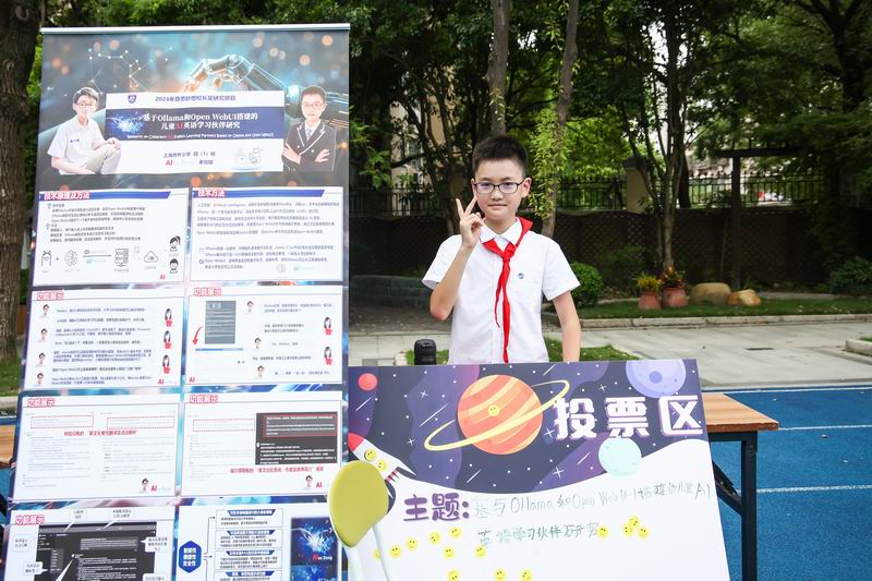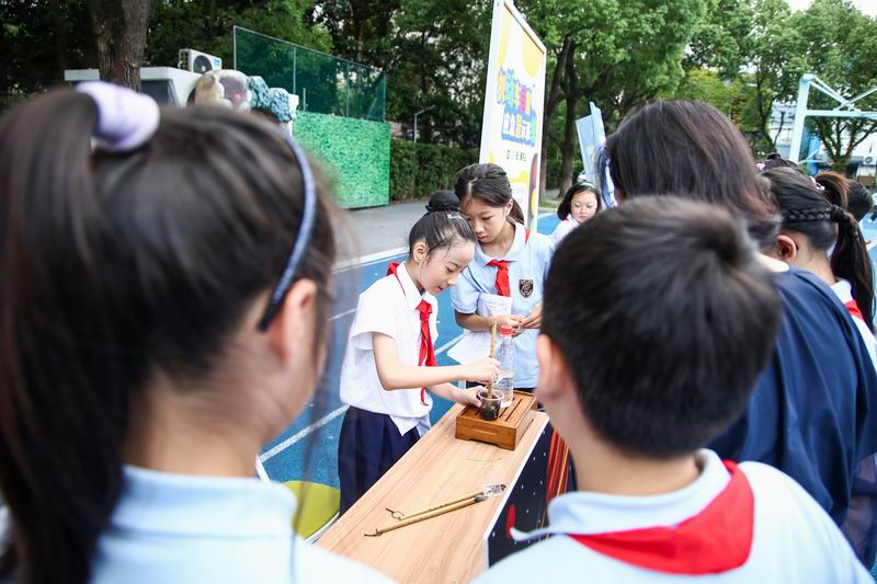 下午的校园展示热闹非凡,三、四、五年级的同学们来到每个展台前,认真聆听选手的讲解,兴致勃勃地参与互动演示。