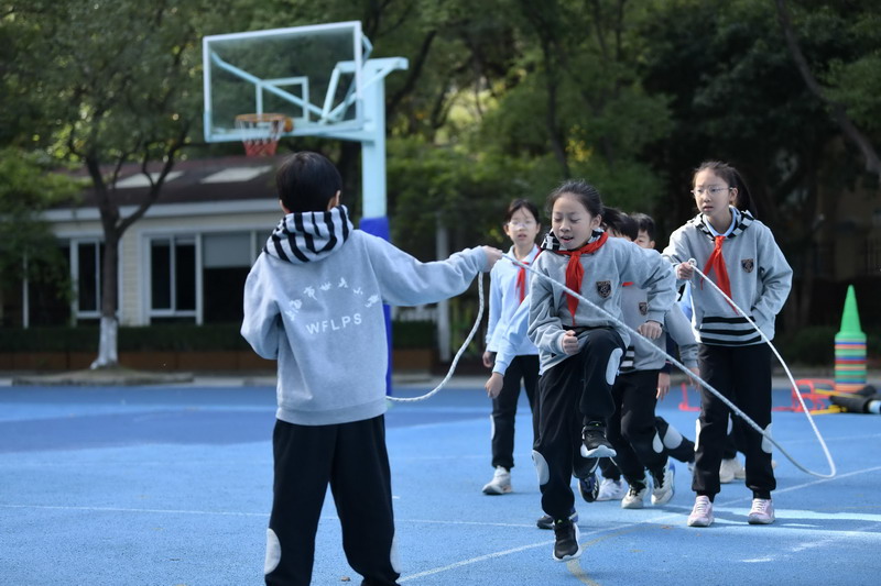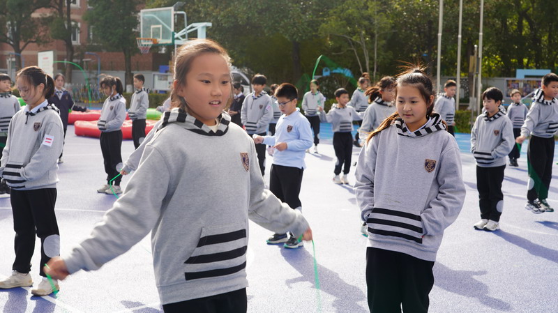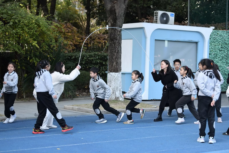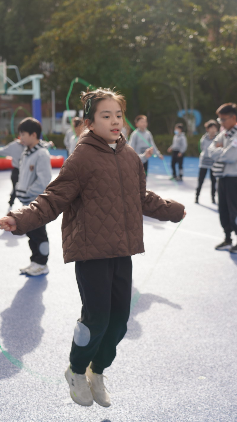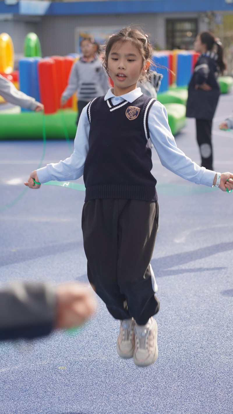 长绳赛场边,摇绳的同学手臂有力摆动,绳子击打地面发出“啪嗒啪嗒”的节奏声,参赛队员们找准时机依次跃入,像一群灵活的小松鼠在绳间穿梭。