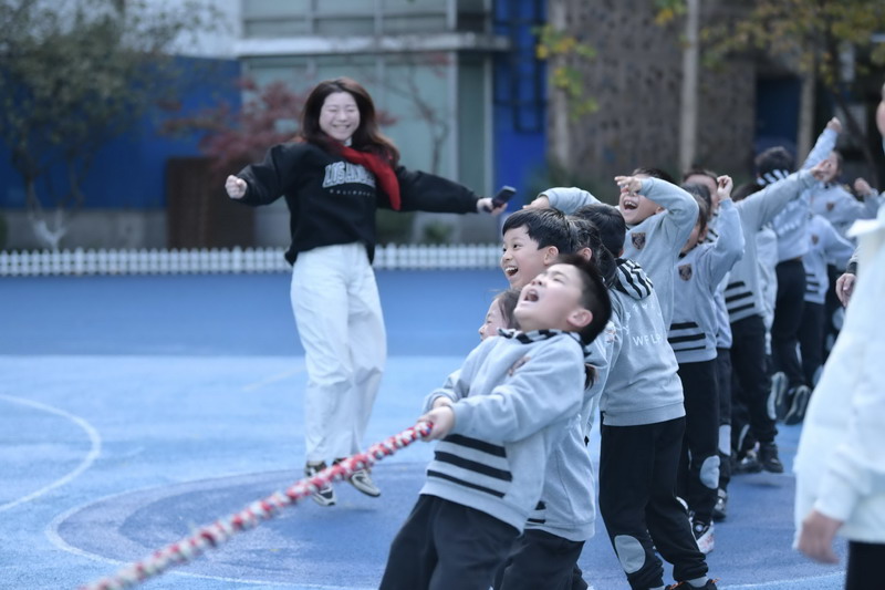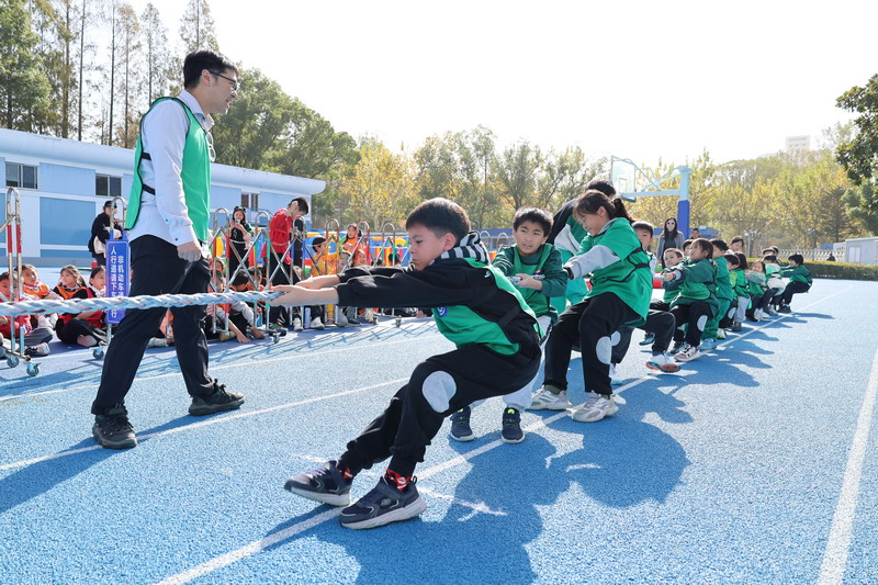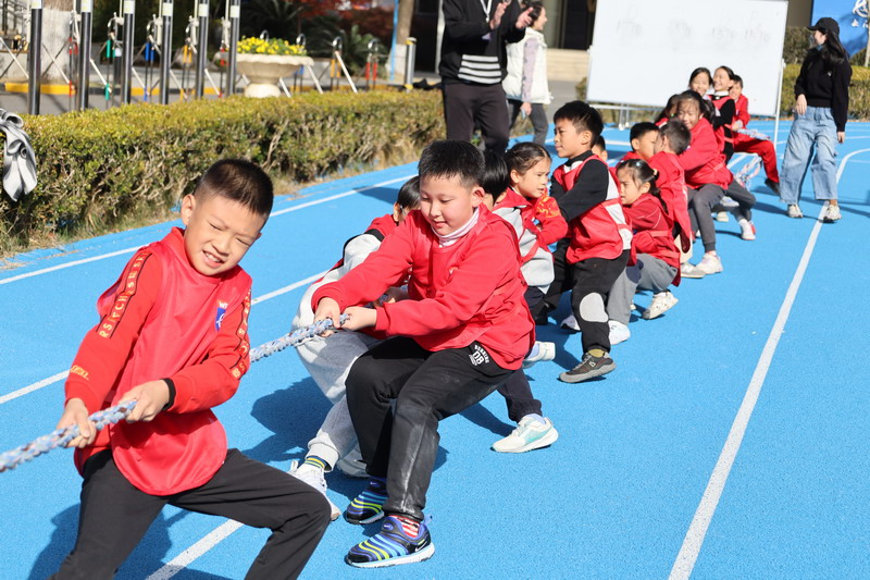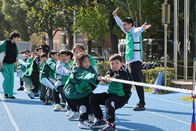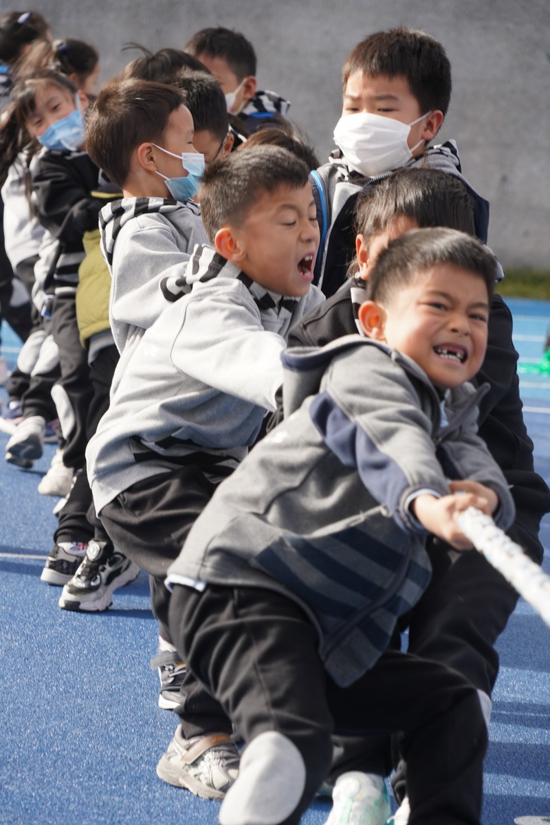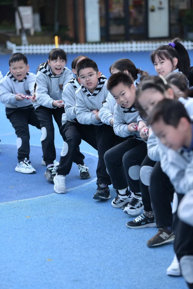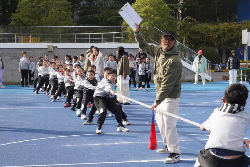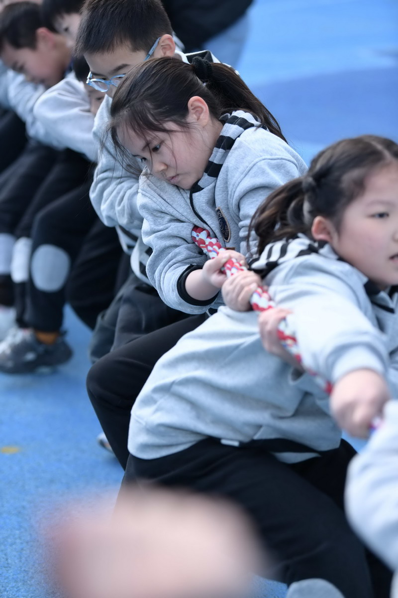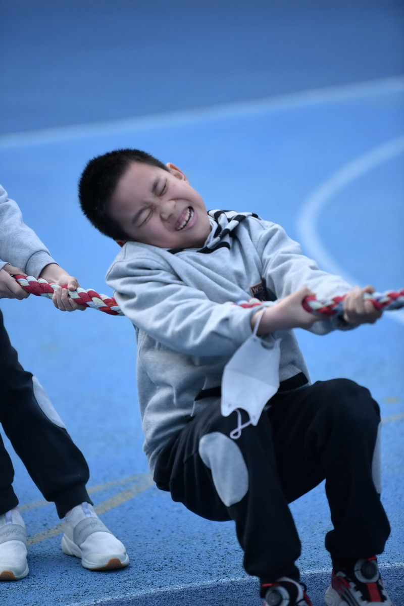 更令人热血沸腾的是特别设置的师生对抗赛。平时温柔儒雅的老师们此刻化身 “超级大力士”,撸起袖子、紧握麻绳,与小选手们展开激烈角逐。赛场边,加油声、呐喊声、欢呼声此起彼伏,师生们不分彼此、全力以赴,每一个奋力拼搏的身影都闪耀着团结的光芒。